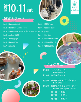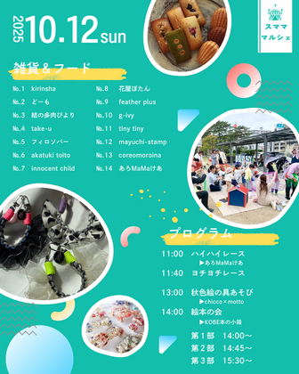 | 10/11(土) 11:00~16:00 | つきみまるしぇ 須磨海浜公園内 すまっこひろば 様にて (神戸市須磨区若宮町1丁目3)駐車場有料 |